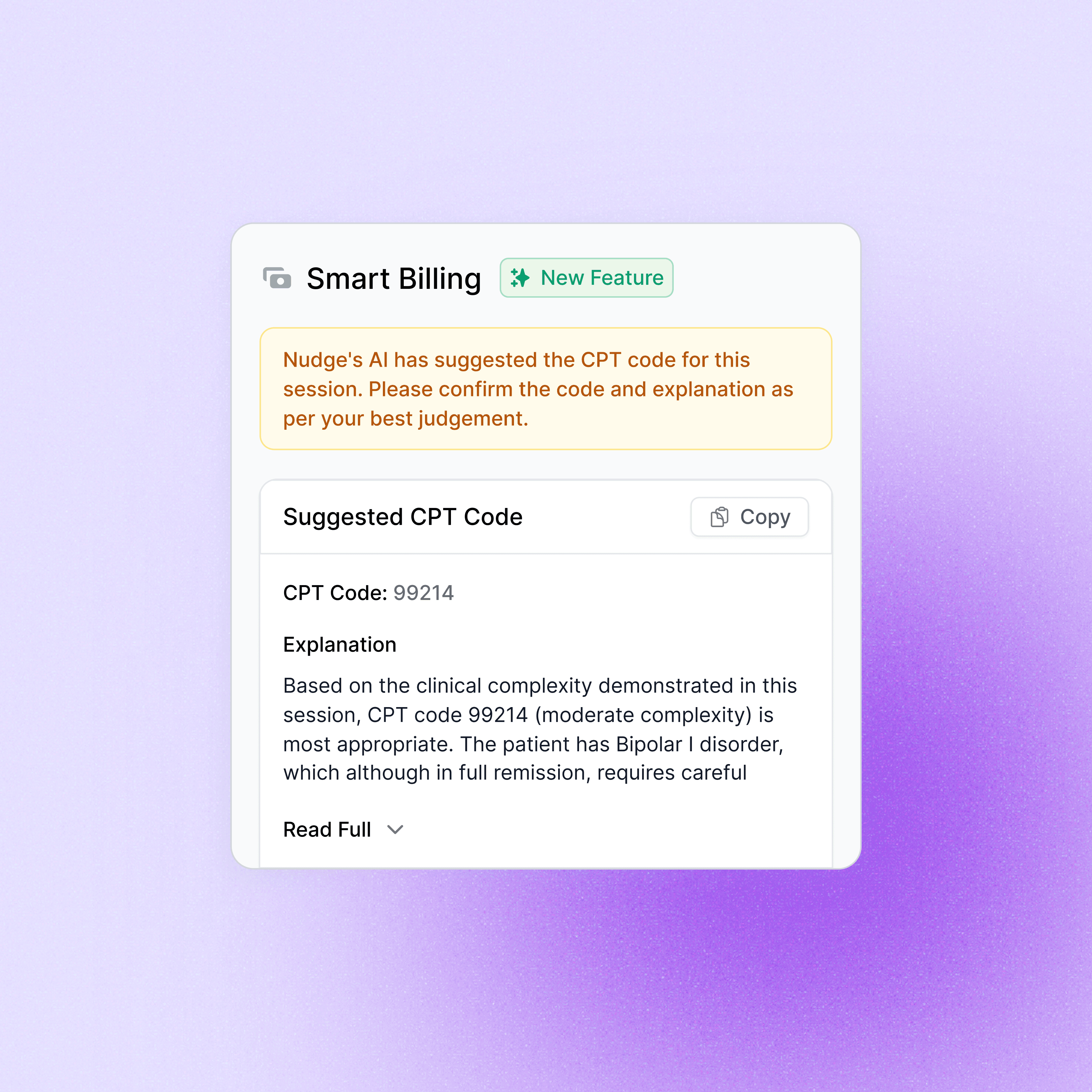 "I used to second-guess every billing code. Was this a 99213 or should it have been a 99214? It slowed me down and honestly so stressful. With the AI flagging codes based on my session and giving me the justification, I don't have to waste time debating with myself."