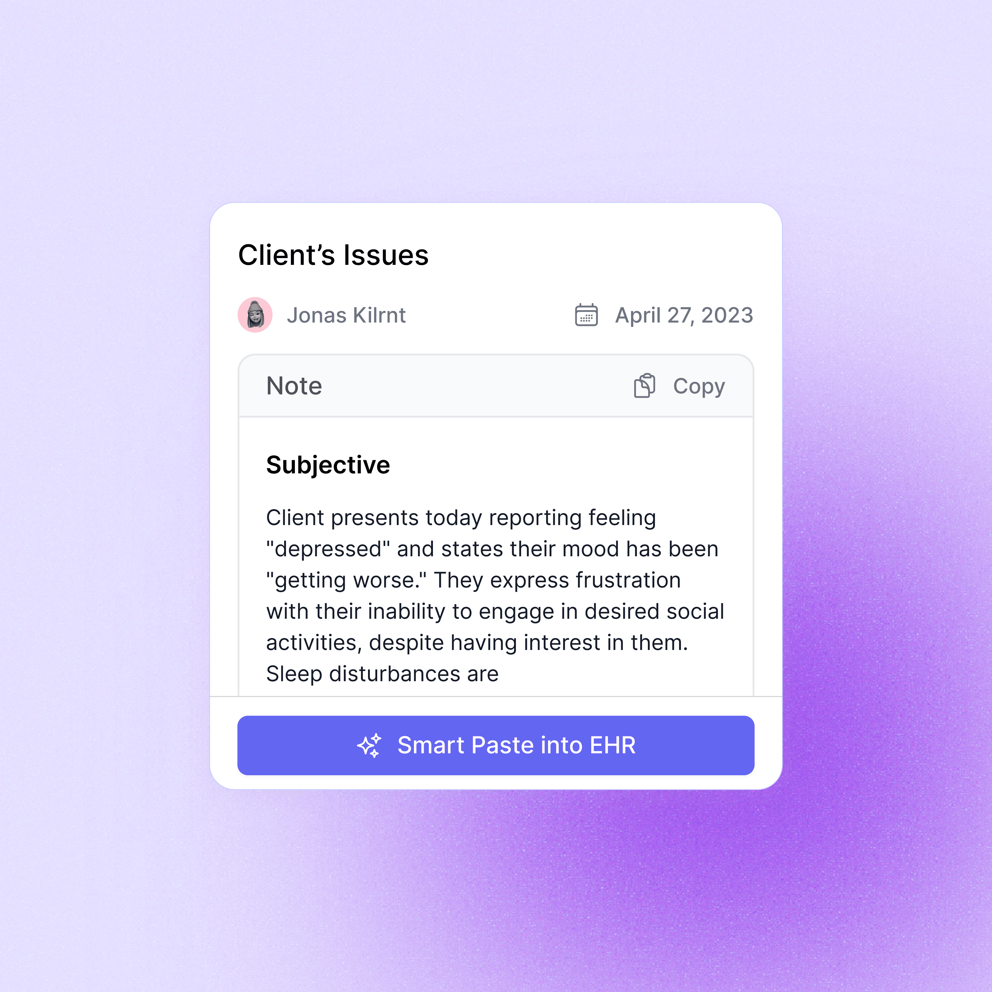 Complete your documentation workflow without leaving your EHR. Capture live sessions, generate clinical notes in your style and transfer them with one-click into 25+ EHRs. Say goodbye to manual copy-pastes or continuous tab switching.