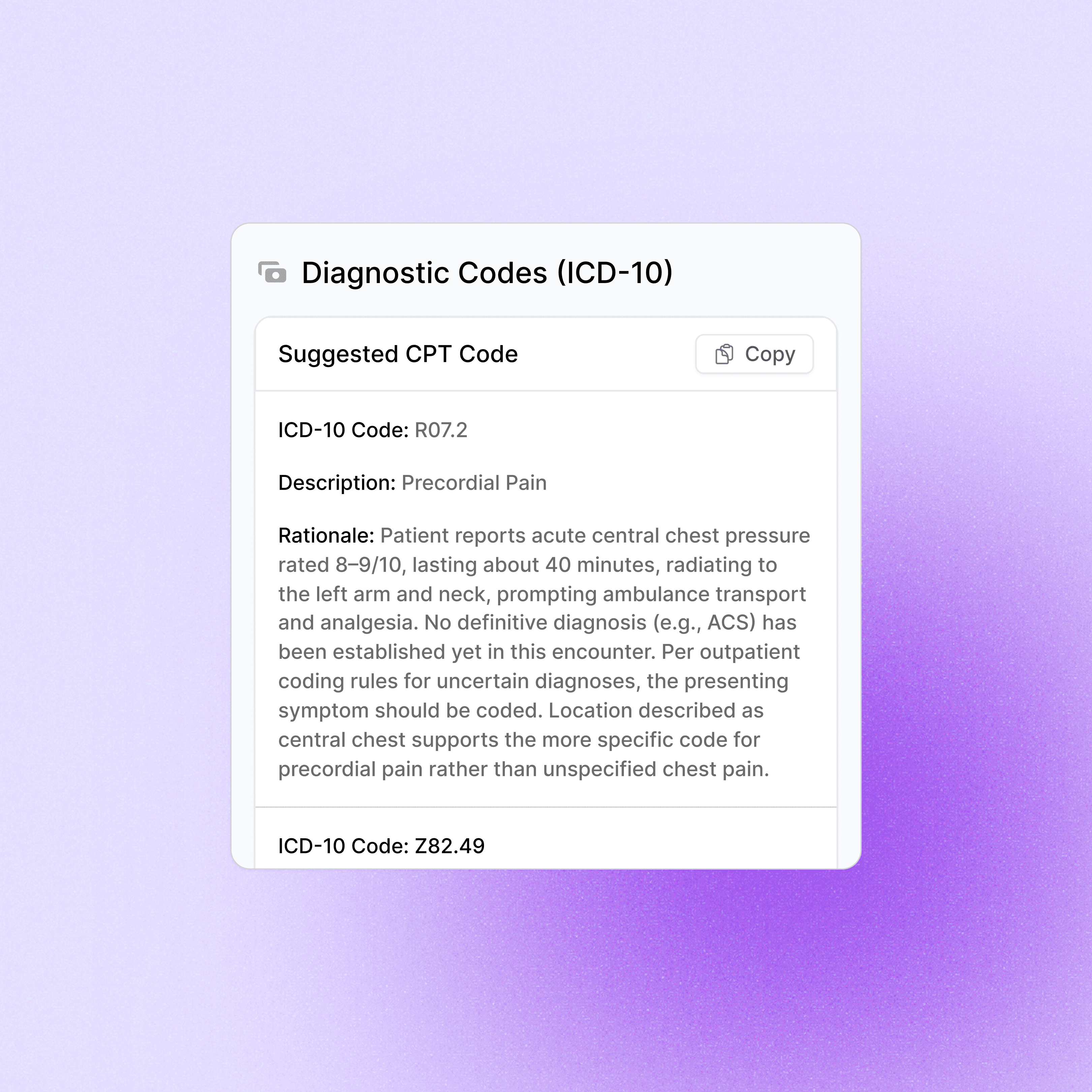 Automatically generates precise ICD-10 diagnostic codes with supporting rationale by extracting clinical evidence from your sessions, ensuring proper disease classification across all specialties.