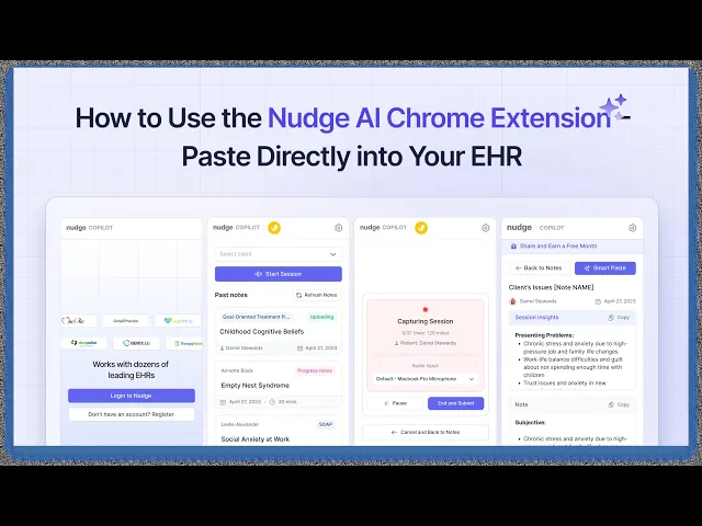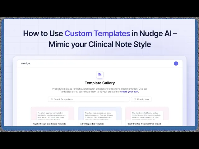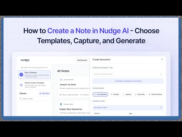 Nudge's AI transforms your session recordings, dictations, audio files, or written content into insurance-ready clinical notes in under 60 seconds. Choose from standard templates (SOAP, Intake, Psychiatric Intake) or quickly create your own custom template to match your documentation needs.